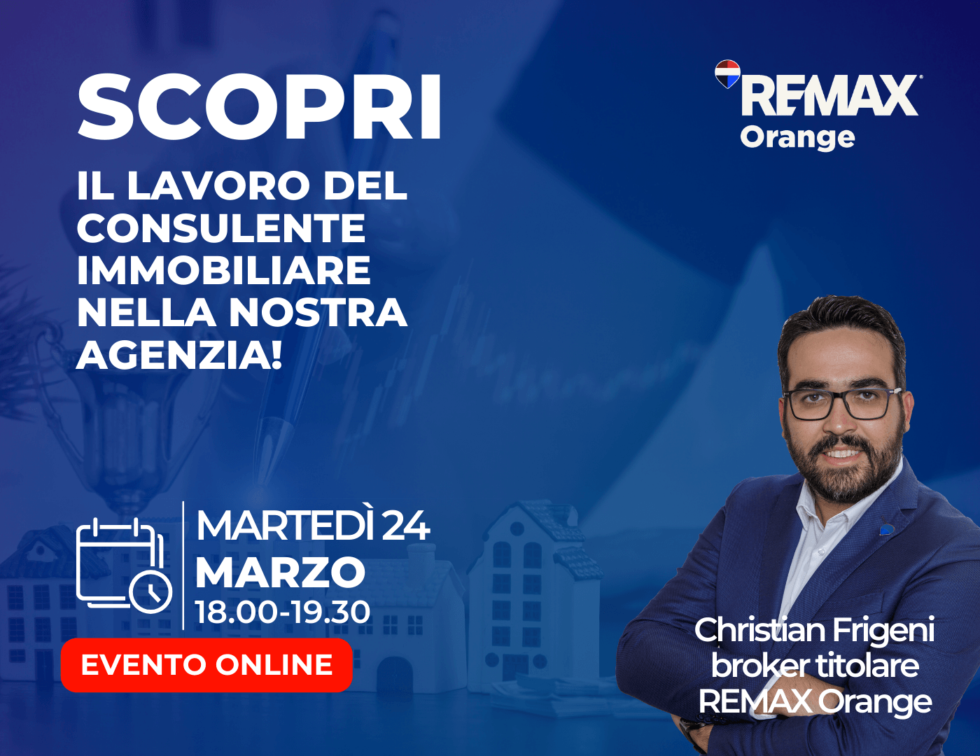 Partecipa al nostro evento esclusivo ONLINE dedicato a chi vuole scoprire come diventare Consulente Immobiliare con RE/MAX ORANGE a Bergamo e provincia!